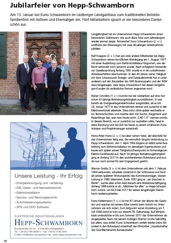 13. Januar 2018: Kuno Schwamborn lud im Liedberger Landgasthaus zum traditionellen Betriebsfamilienfest mit Aktiven und Ehemaligen ein. Fünf Mitarbeitern sprach er ein besonderes Dankeschön aus.