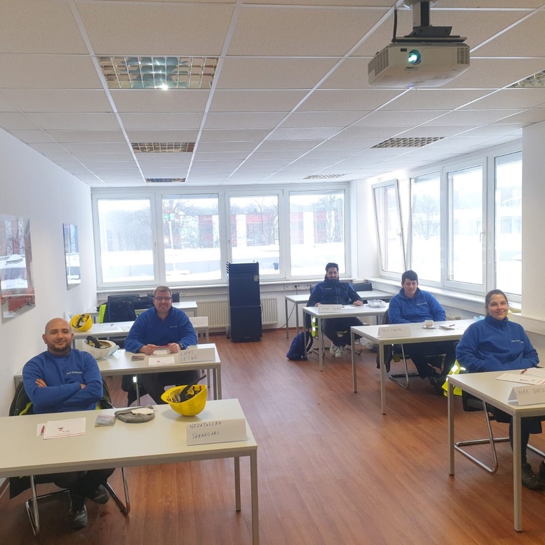 Die "Nationale Bedienerschulung für Scherenarbeitsbühne und Teleskop-, Gelenk- und Kettenarbeitsbühnen" ist durch den TÜV Rheinland zertifiziert und beinhaltete neben theoretischen Inhalten wie der Thematisierung einschlägiger Rechtsvorschriften, physikalischer Grundlagen und sicherer Betriebsverfahren auch einen praktischen Teil. Hier wurden die pandemiebedingt in Kleingruppen aufgeteilten Schulungsteilnehmer in die selbständige Handhabung von Hubarbeitsbühne und Stapler eingewiesen und konnten das Gelernte direkt vor Ort in die Praxis umsetzen.