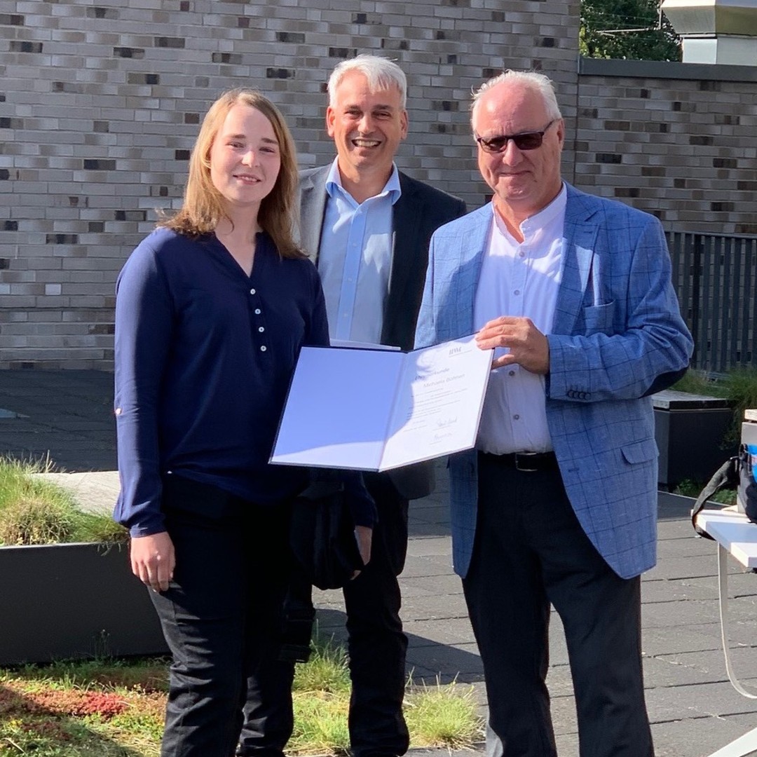 September 2021: Frau Michaela Bohnen wurde kürzlich durch die Kreishandwerkerschaft Mönchengladbach als Jahrgangsbeste des Abschlussjahres 2020 im Lehrberuf "Elektronikerin für Energie- und Gebäudetechnik" ausgezeichnet (v.l.n.r.: Frau Michaela Bohnen, Herr Stefan Bresser, Geschäftsführer der Kreishandwerkerschaft und Herr Reinhard Esser, stellvertr. Kreishandwerksmeister).