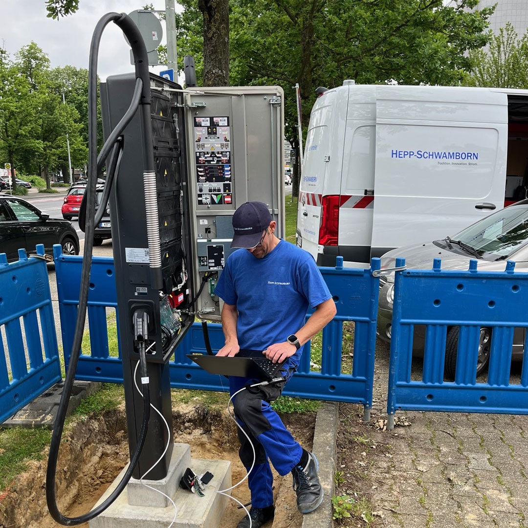 June 2024: The topic of electromobility has long been an integral part of our daily work. Here, employee Patrick Schröder is installing a HyperCharger - a fast charging station with a connected load of more than 100 kW.