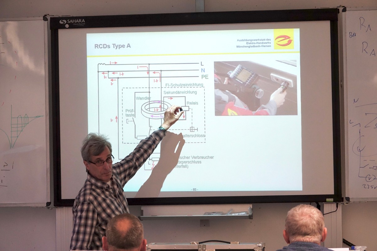 The further training comprised of two days and included an E-CHECK seminar according to DIN VDE 0100-600, a seminar on the operation of electrical systems according to DIN VDE 0105, as well as the constantly growing topic of testing electric charging columns from the e-mobility sector.