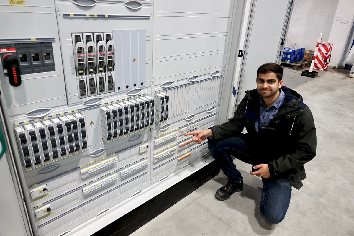 Project manager, David Beckers, from Hepp-Schwamborn presenting the planning, construction and installation, which he was responsible for, using the example of one of the switch cabinets he built and installed himself, wherein countless meters of cables from large parts of the hall converge.