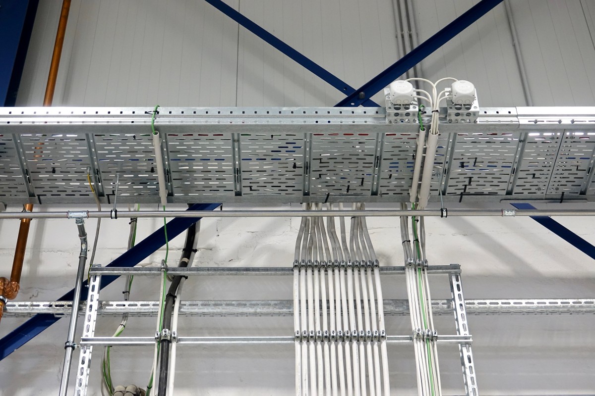 "Due to the transverse steel girders under the hall ceiling, we had to use so-called "wide span gutters” along the long side of the hall, which are characterized by wide support spacing and therefore need to be supported much less frequently. We were able to use conventional cable platforms running along the girders, which are supported at shorter distances. For fastening, we had to resort to a clamping technique with metal clamping claws, which are only clamped and screwed. In this way we avoid drilling into the steel girders for safety reasons.”