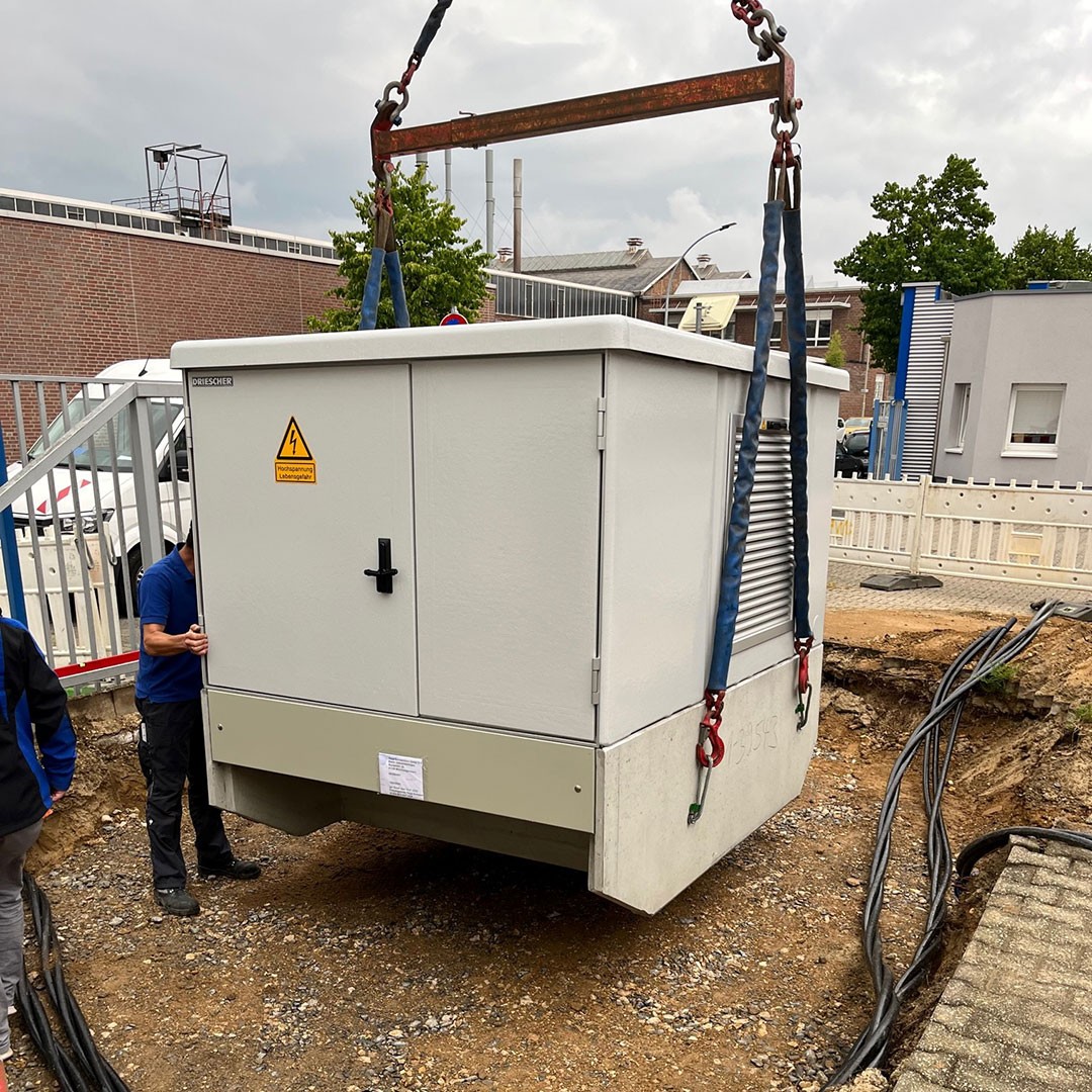 August 2022: A new transformer station adorns our depot in Mönchengladbach. This was an important step, as a larger transformer station was necessary solely in view of the ever-increasing importance of electromobility. A total of six charging pillar connections for electric cars are already supplied - and sufficient power reserves for the future are also available.
